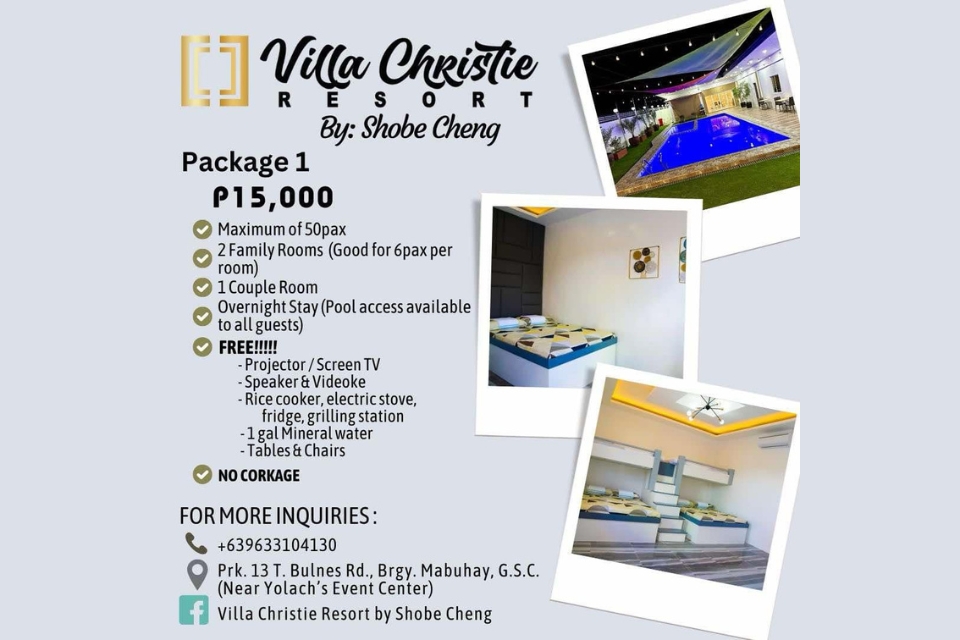 Experience an unforgettable getaway with Package 1 at Villa Christie Resort! Perfect for up to 50 guests, this package offers comfortable accommodations, including two spacious family rooms (for six guests each) and a cozy couple’s room. Enjoy an overnight stay with full pool access for all guests. Plus, take advantage of our complimentary amenities, such as a projector, screen TV, speaker with videoke, kitchen essentials, and a grilling station. Tables and chairs are also provided, along with one gallon of mineral water. Best of all, no corkage fees apply, ensuring a hassle-free celebration!