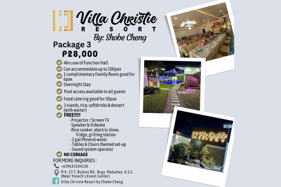 Host a grand celebration with Package 3 at Villa Christie Resort, perfect for up to 100 guests. Enjoy a 4-hour function hall rental and a complimentary family room for six guests, plus an overnight stay with full pool access. This package includes food catering for 50 guests, featuring three viands, rice, soft drinks, and dessert, served by waiters. Complimentary amenities include a projector, screen TV, speaker with videoke, sound system operator, essential kitchen appliances, and a grilling station. Tables and chairs are also provided with a themed setup. No corkage fees apply for a stress-free event!
